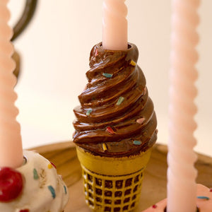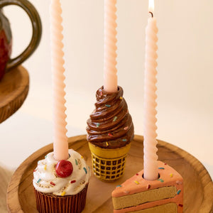 Save room for dessert! This set of three ceramic taper holders is in the shape of a cake slice, an ice cream cone, and a cupcake. They each hold one taper candle.