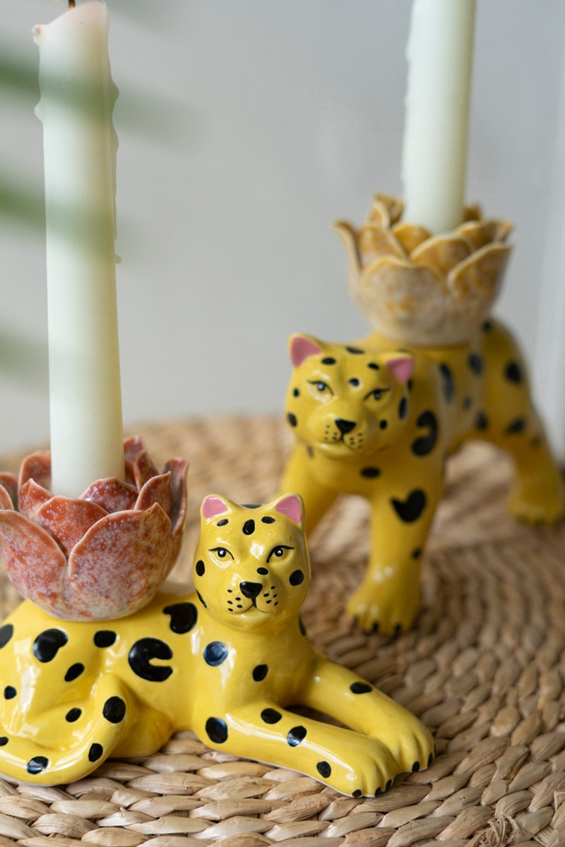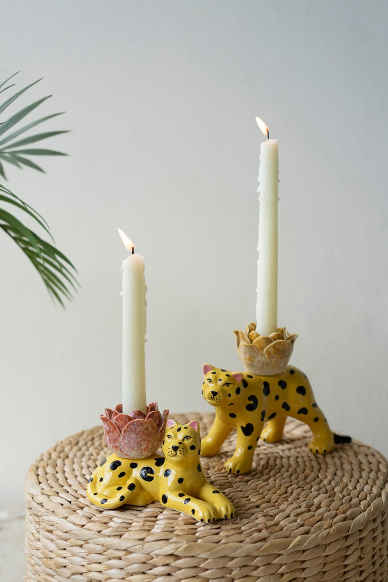 Snag this set of two ceramic cheetah candle holders. They hold one taper each. One is reclining while the other is ready to pounce.