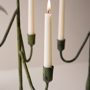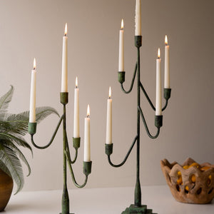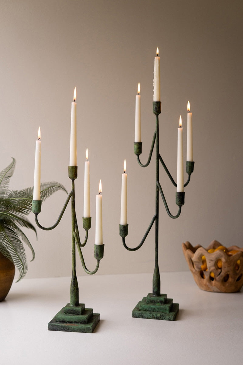 Wow your guests with this set of two taper candelabras with a green patina. The two sizes hold nine tapers in total. The large is 27" tall.