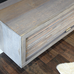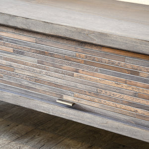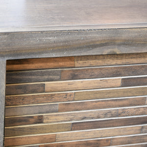 The expertly crafted butcher block pattern solid wood roll-up doors are made with various hand selected repurposed wood slats. These doors take more time to make, but prevent filling landfills by using eco-friendly recycled end cuts. The tambour doors conveniently slide up and down for quick access to the hidden storage spaces. Once closed, the tambour doors conceal their contents displaying the beautiful wood doors. The varying nature of the character, grain, and tone are perfect for tying in other wood tones in your room.