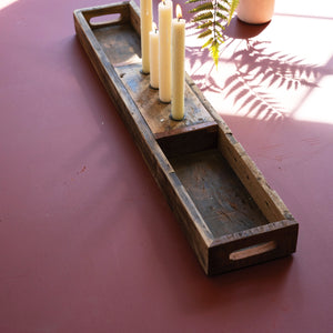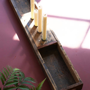 For organization or decor, try this recycled wood tray with center candle holders. The middle holds four taper candles and the sides hold anything you wish. This tray adds character atop a dresser or table.