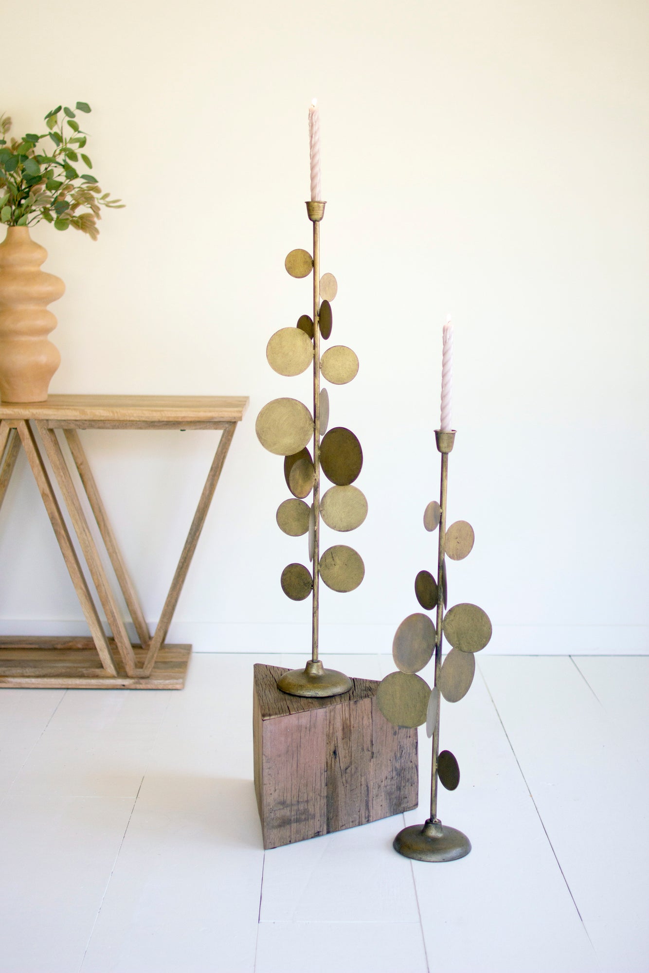 Add some shine to the table with these twinkling candle holders. Made of antique brass with round disc details, each consists of several tabs that reflect their candlelight Grab this set for any room but it's a great choice for romantic dinners in the dining room.