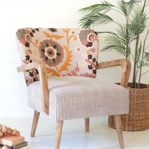 Have a seat! Use this upholstered armchair in more neutral spaces. It stands 33" tall and is handcrafted in India.