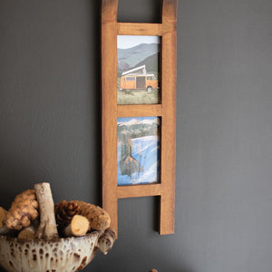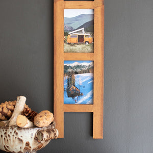 Your mountain home needs this wooden snow ski double photo frame. Display your best memories or give instructions to guests. It is 25.5" tall and holds 2 5x7 photos.
