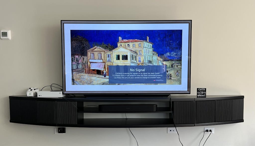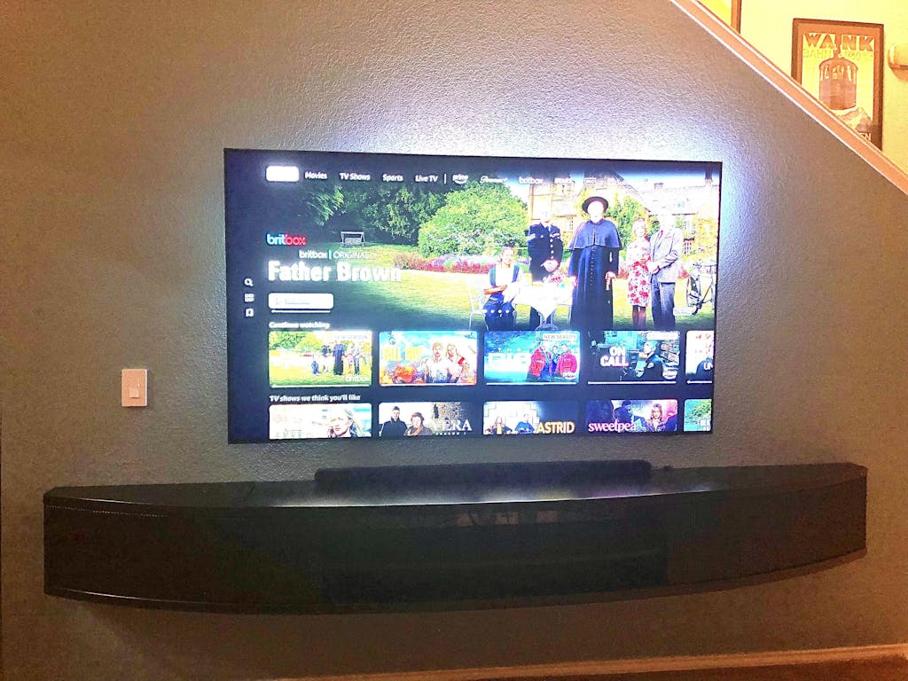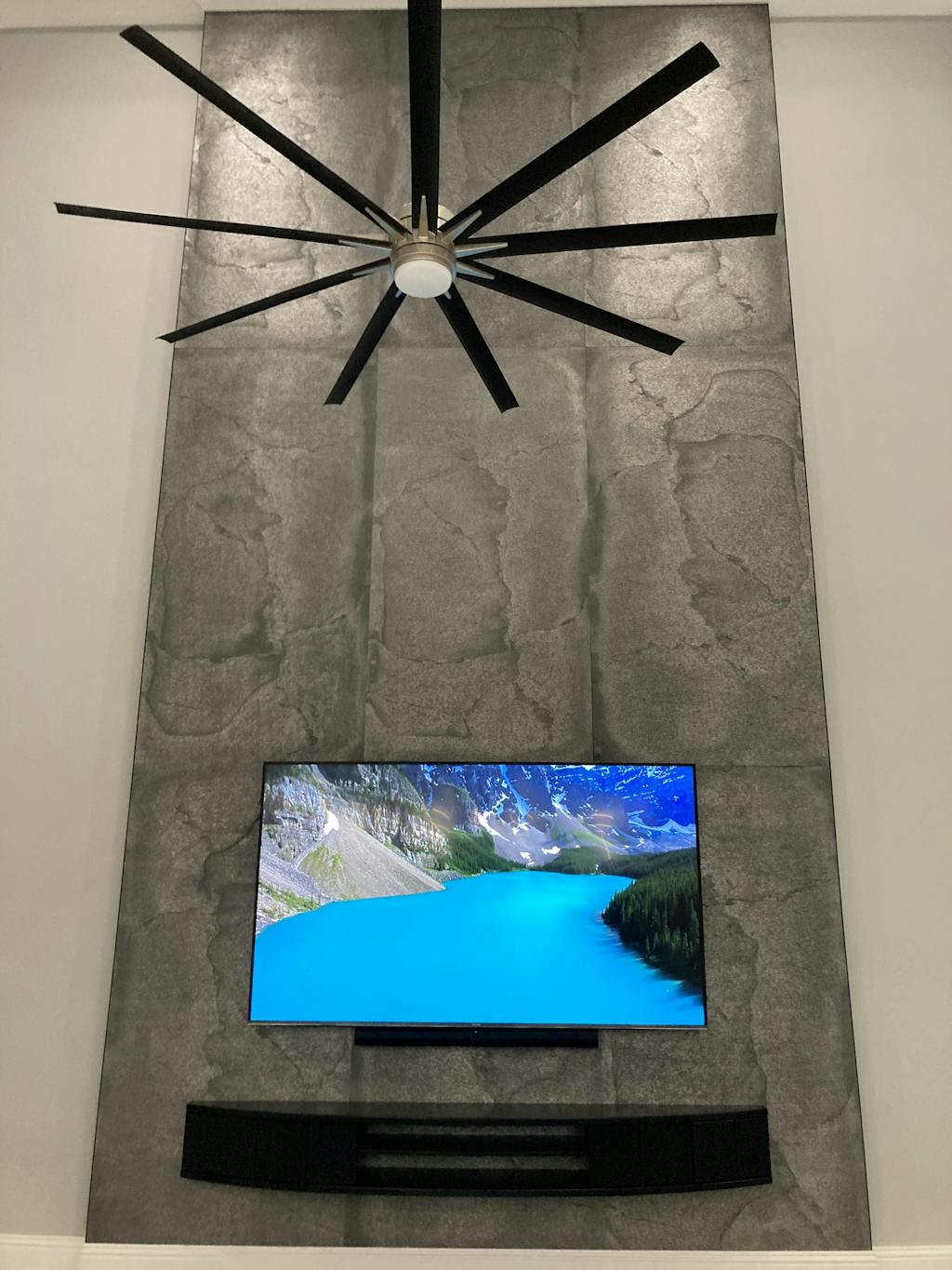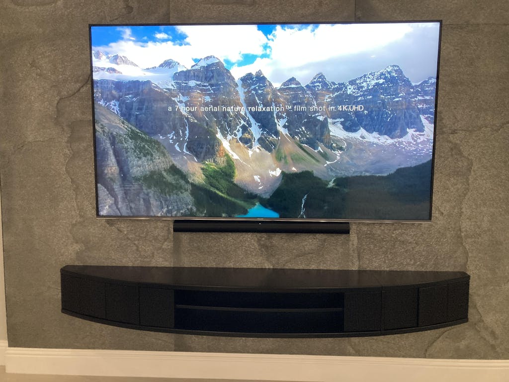 Relatively easy to install and simply beautiful on our 2 story granite TV Great Room wall. The large black Arc console was a perfect match for our 100” TV.