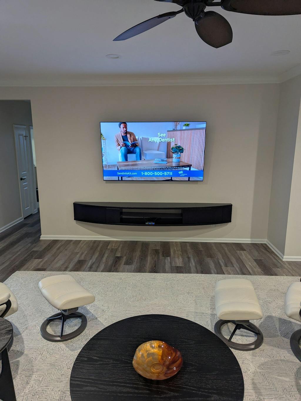 We love our curved wall mounted entertainment center. Only small issue I would point out is, with this coming in 3 seperate pieces having to try to line them up .