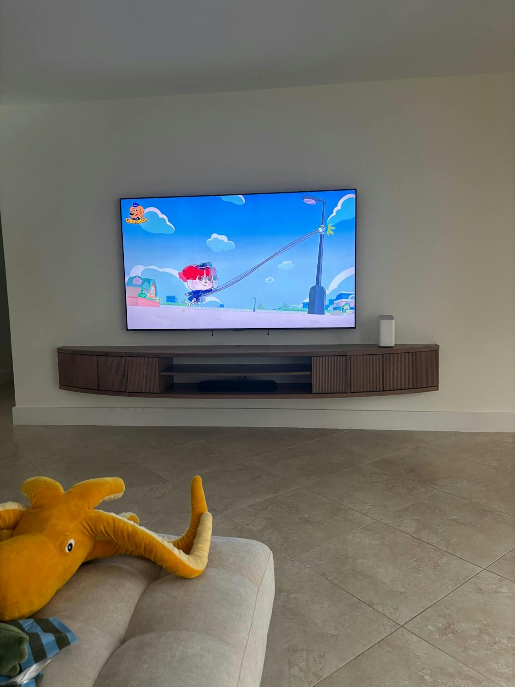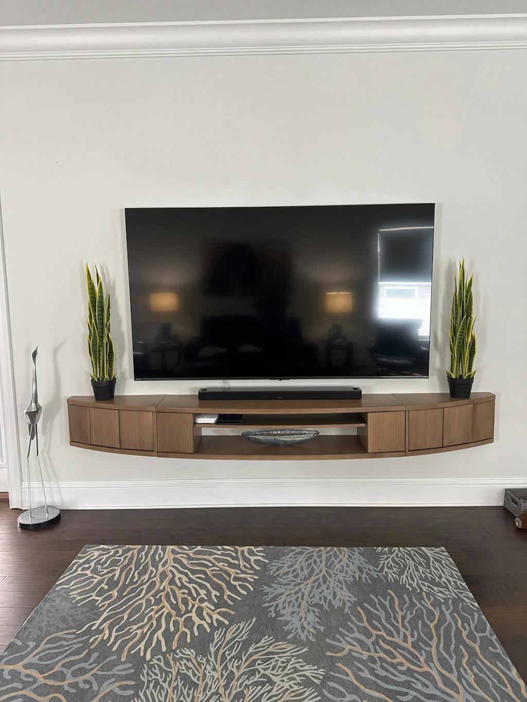 This is the perfect size and balance to our 85” tv. It is sturdy and high quality and comes in three fully assembled parts. We wanted something that wouldn’t look lost with such a large tv but also wouldn’t take up too much/any floor space and this fit the bill. A lot of floating media console’s are very modern It’s not too modern but this fits well with different decor styles.