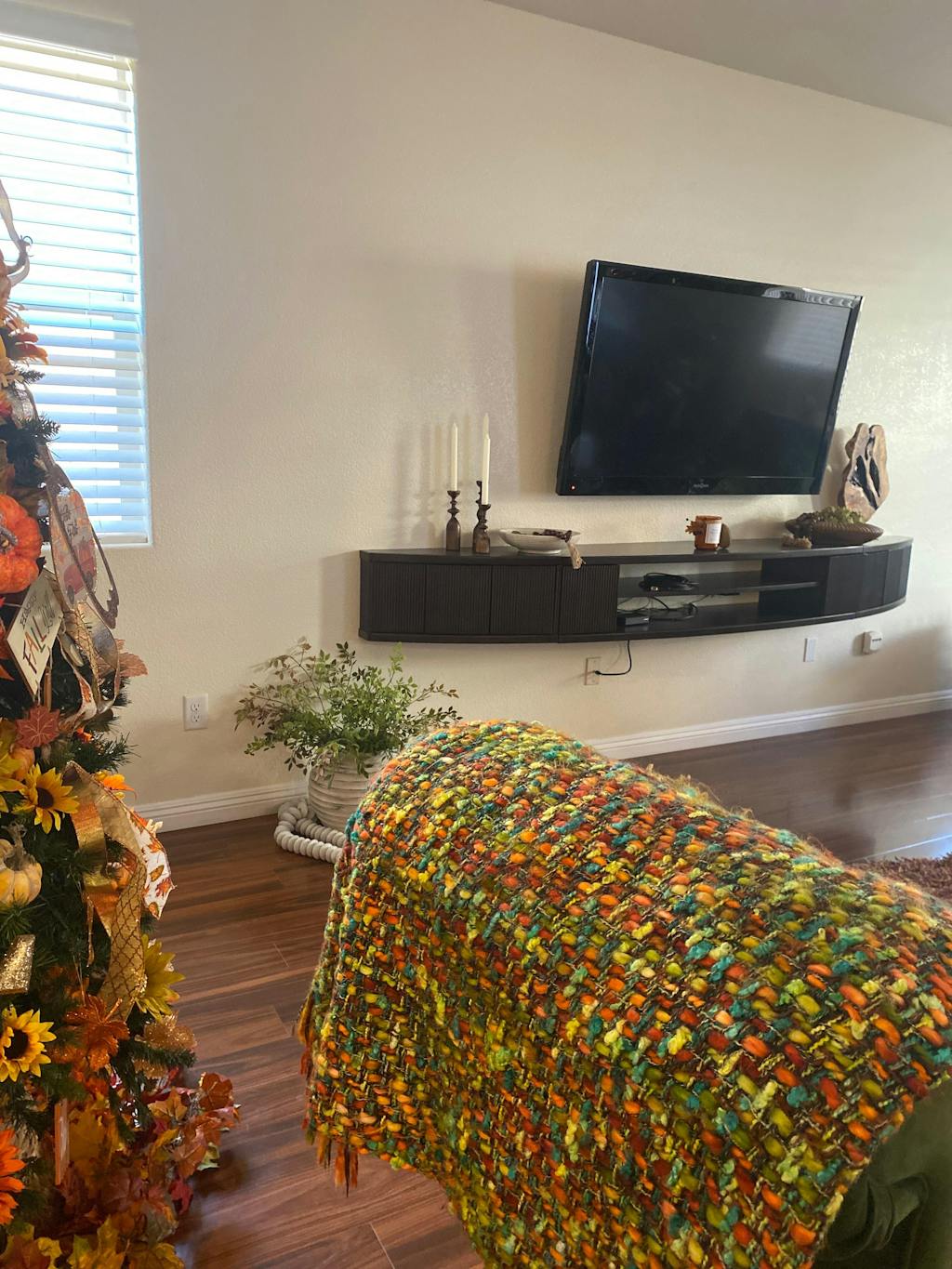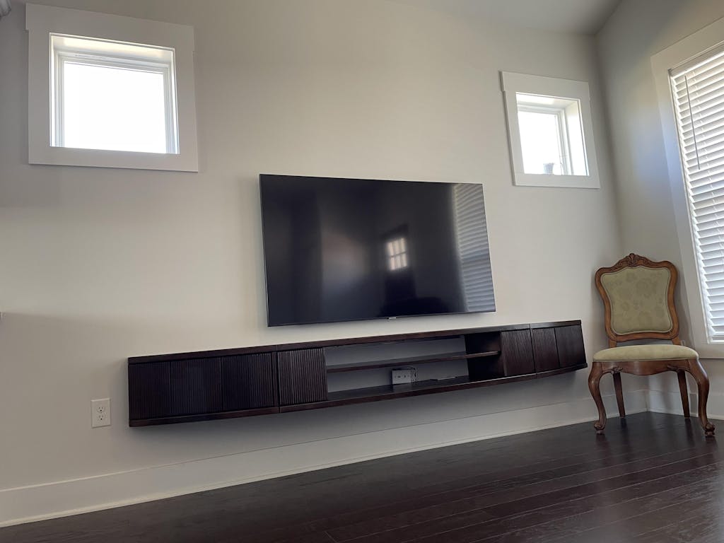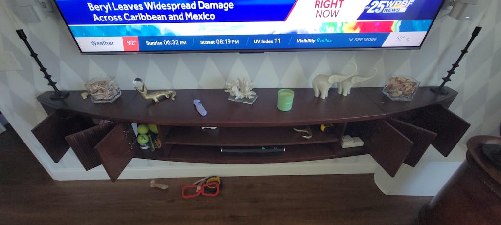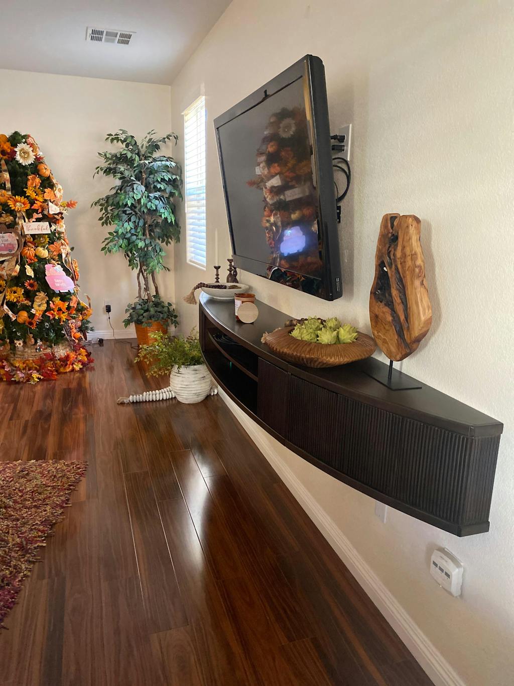 Pleasantly surprised by the quality and the wood is beautiful. It looks great and it was pretty simple to install and level. We needed something very long because we bought a larger TV to fit the wall and this unit from WoodWaves works perfectly. Not sure what else to say, except that we love it and would recommend it to anyone.