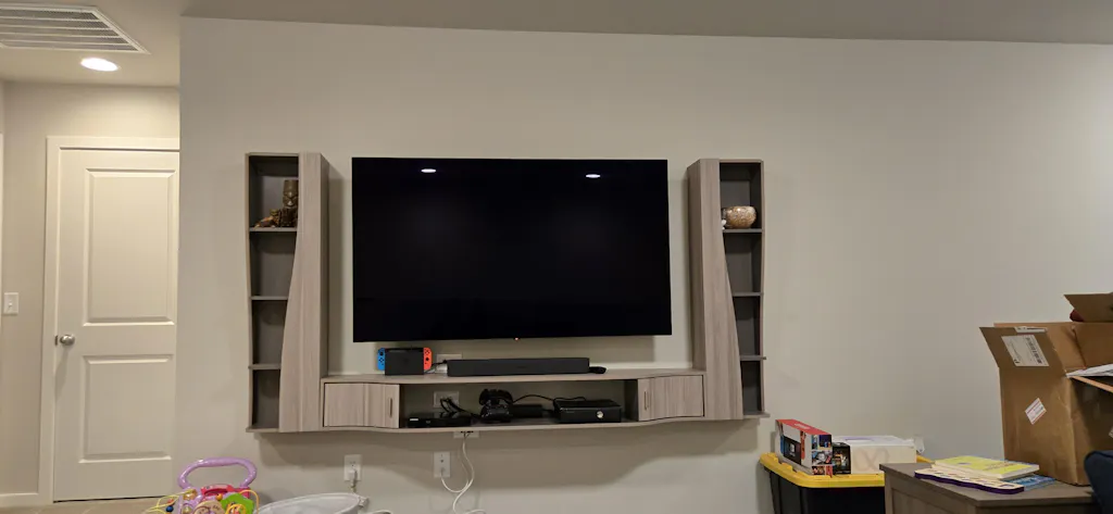 This is an absolutely beautiful setup. It looks great and for the most part, the design was well thought out. However, it is rather flimsy. The melamine top is nice and thick which is good, but the underside is just a thin paper veneer. This unit is also made of cheap press board instead of actual wood. For the price of the unit, that is a big negative. I have a toddler and it's only a matter of time before she hangs on it and breaks something. My other complaint is that if you have a situation where you can't recess cables into the wall, there is only a single cord access in the bottom, meaning you would have to drill a hole in the top. Fortunately we were able to do in-wall cables so it wasn't an issue.